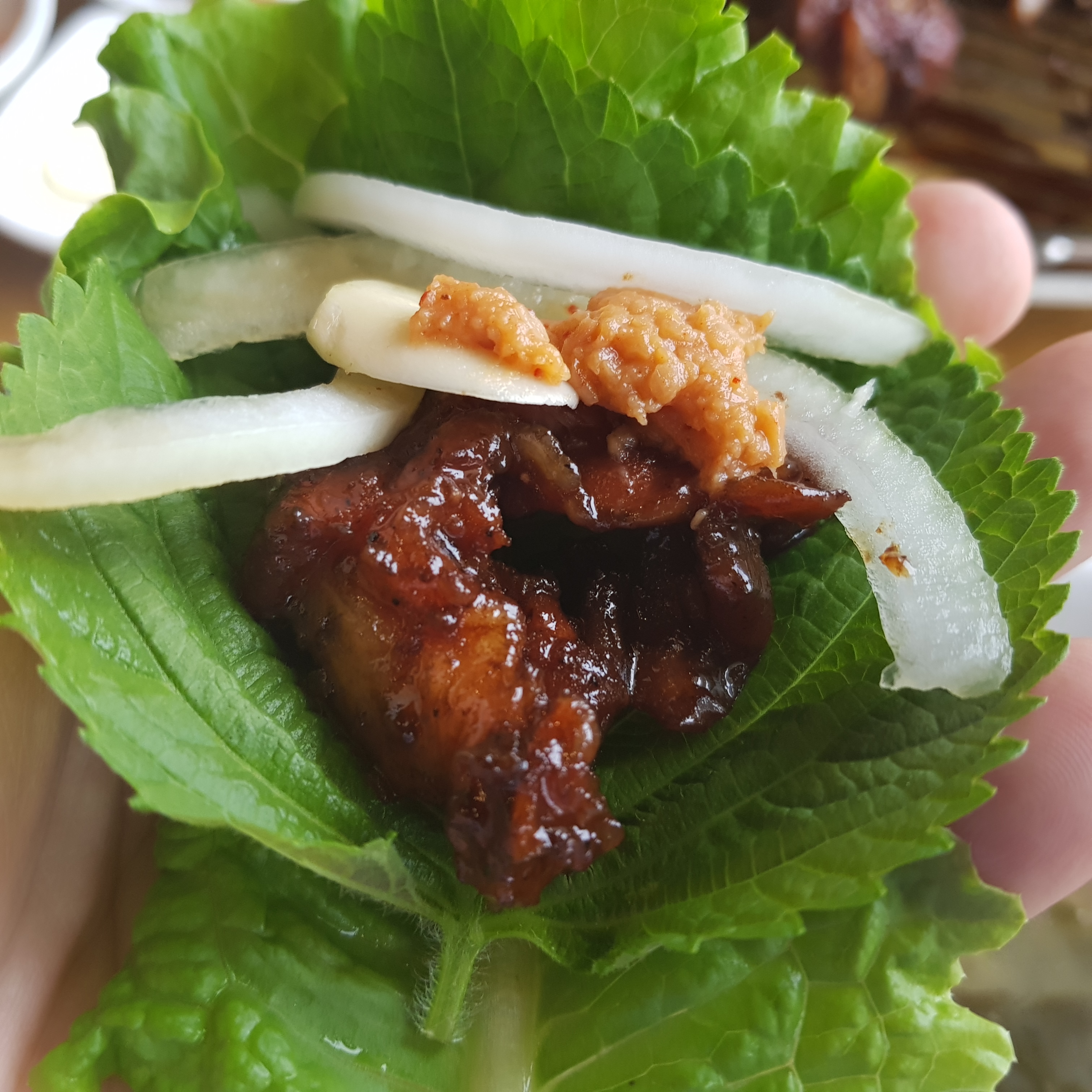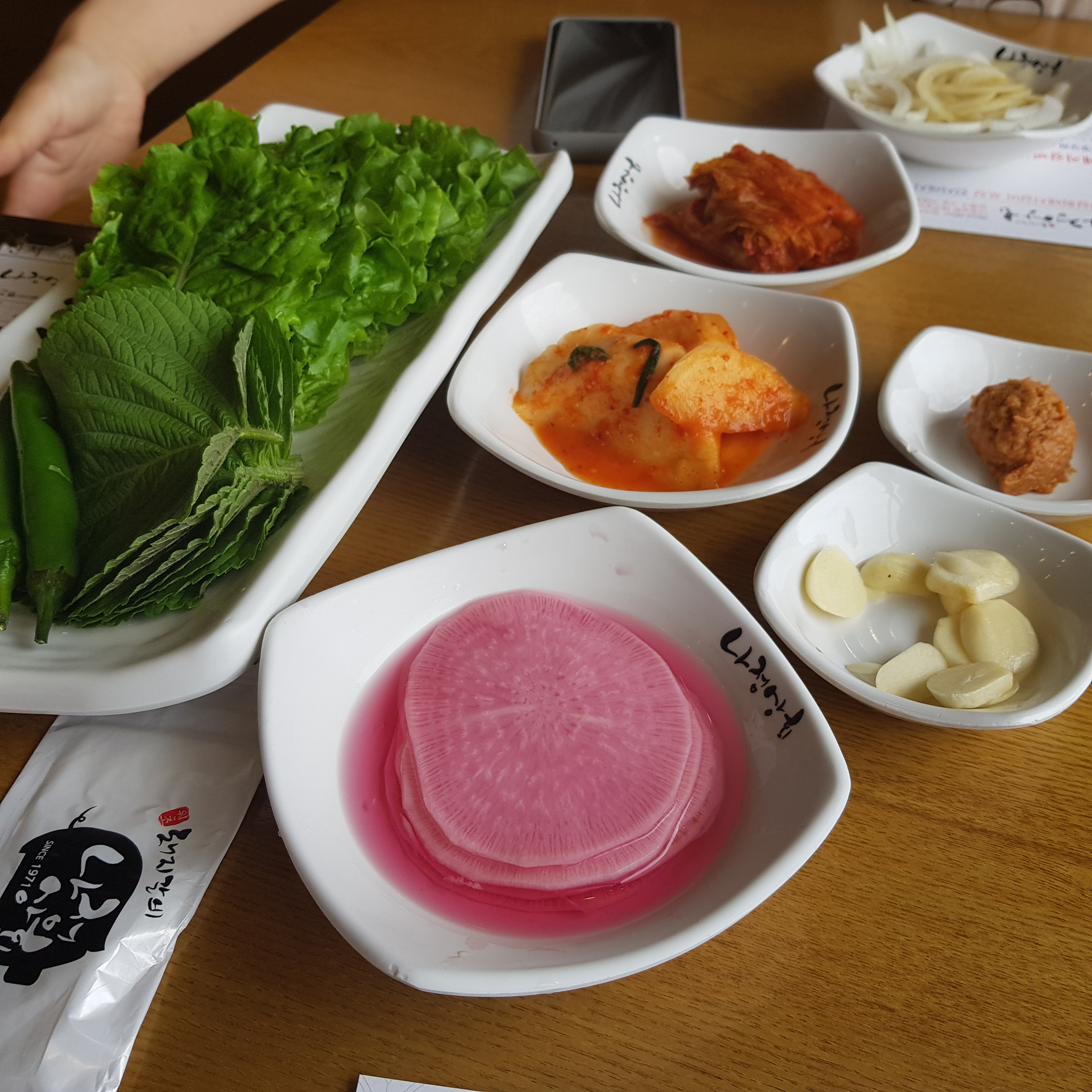 기본적인 상차림은 야채와함께 김치 , 쌈장 , 마늘 , 쌈무 , 간장에 겨자소스가 가미된 양파 무침이 나옵니다.