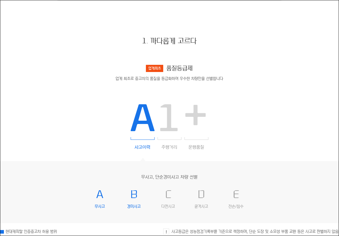 차량 등급은 A , B, C, D , E등급으로 나누어 차량의 등급을 측정하고 A등급은 무사고 , B등급은 경미한 사고 이런식의 등급제를 시행하여 중고차를 구매하는 사람이 쉽게 등급을 알아볼 수 있게 해 두었다.