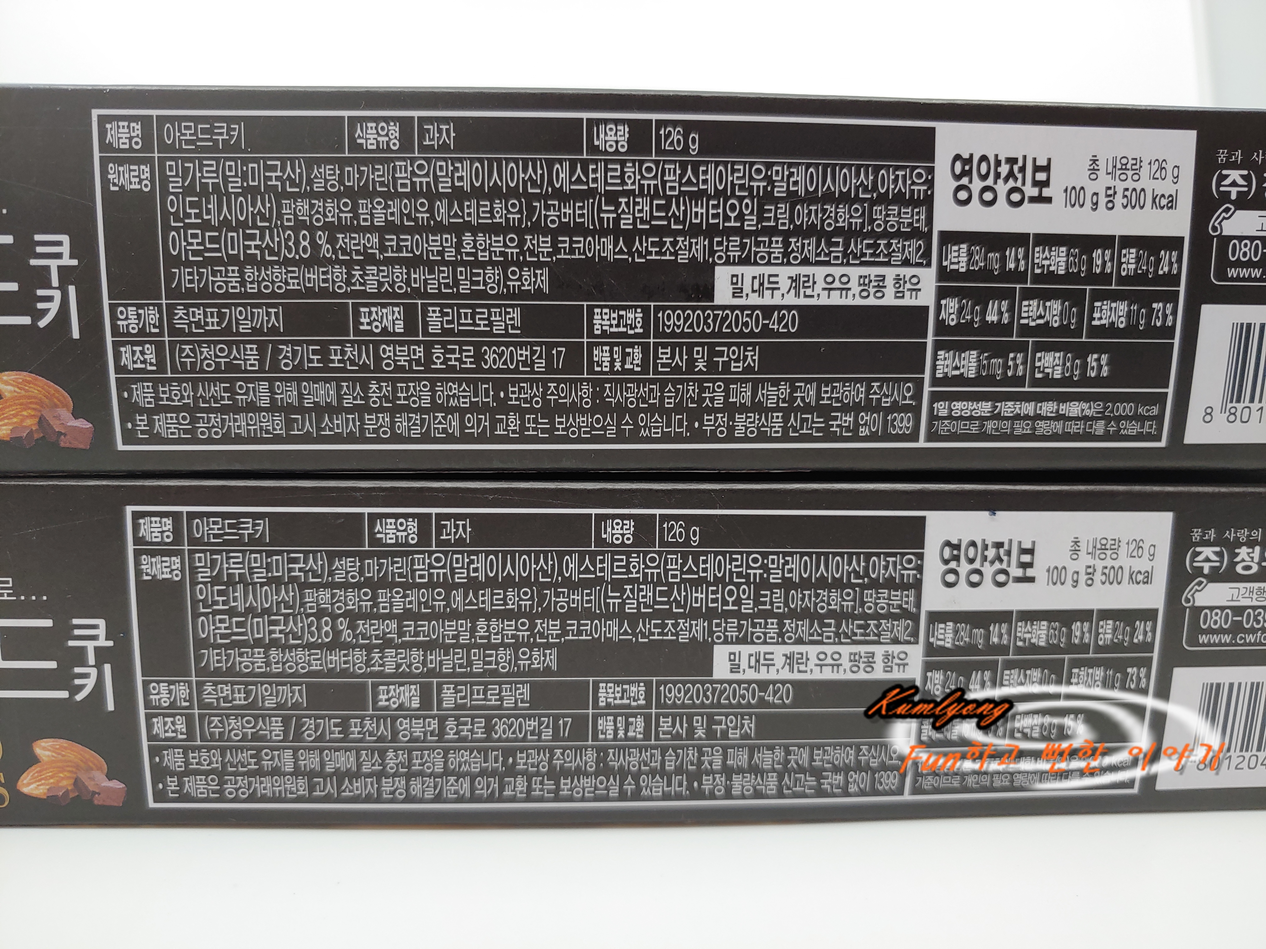 한 박스 기준으로 내용량이 126그램 100그램당 500칼로리의 청우 아몬드 쿠키