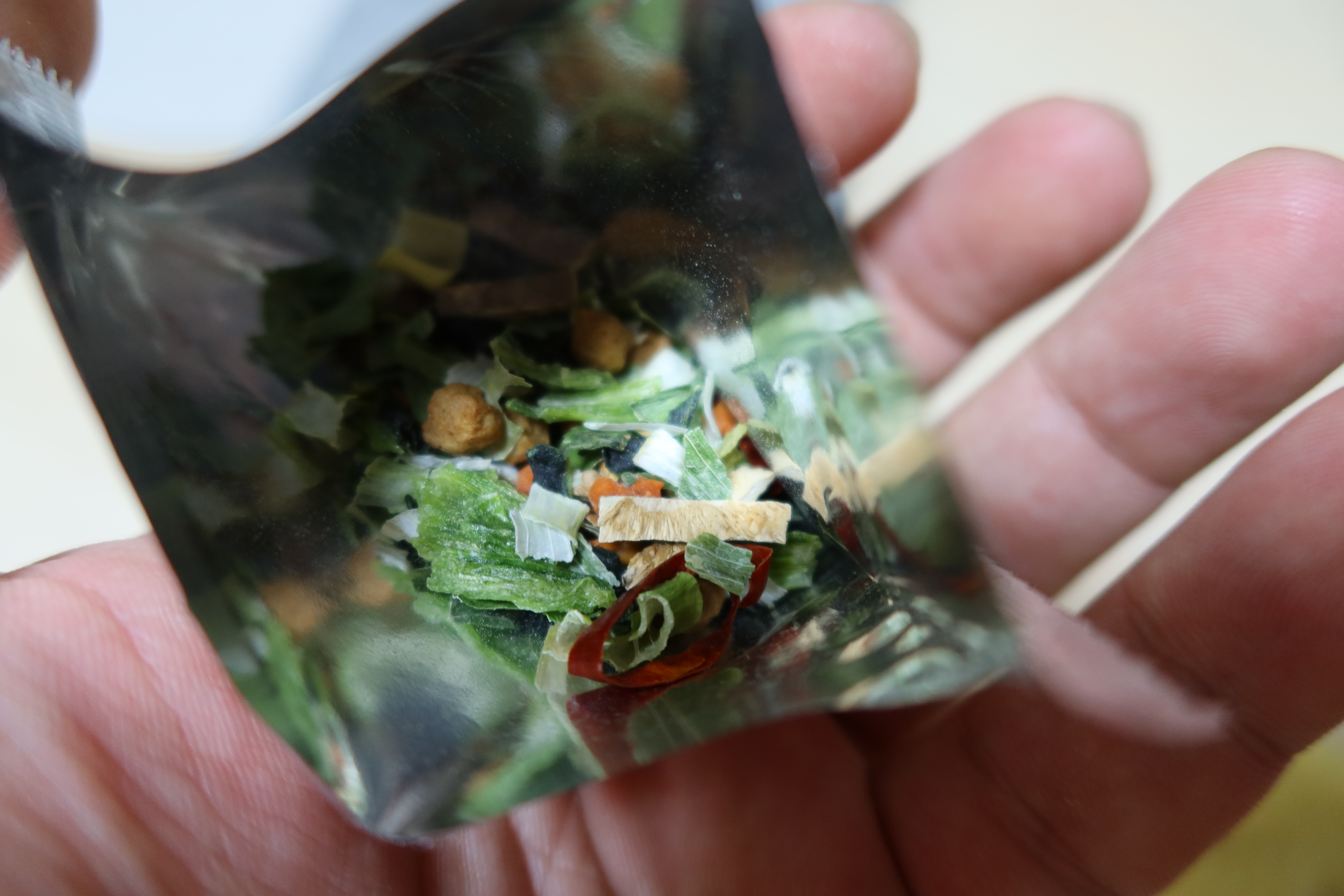 동봉이된 고수후레이크를 뿌린후 잘 저어 먹으면 된다.