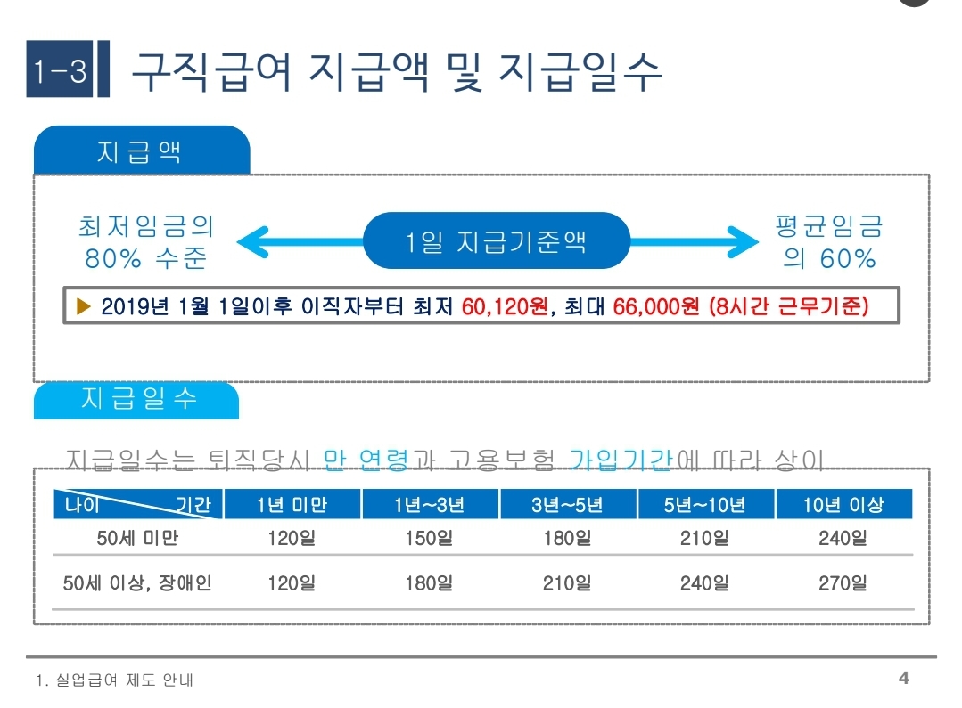 이직전 평균임금 60% x 소정급여일수로 지급되며
