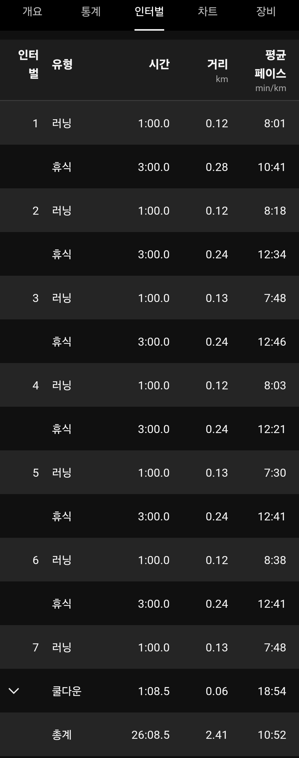 1분뛰고 3분 걷기 7세트로 첫 발을 내어보았습니다.